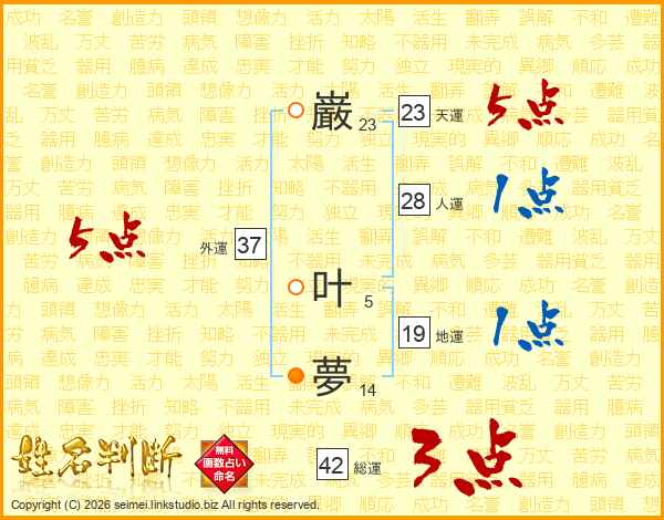 生活面を象徴する運勢です。外部から受ける影響力を表し、結婚運、家庭運や職場、環境への順応性を表します。総運から人運を引いた画数。姓や名が1文字の場合を除く。