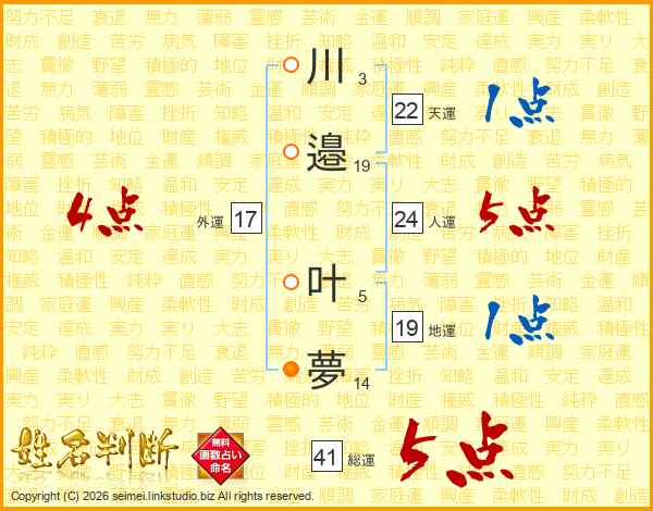 川邉叶夢さんの総運は41画の5点!