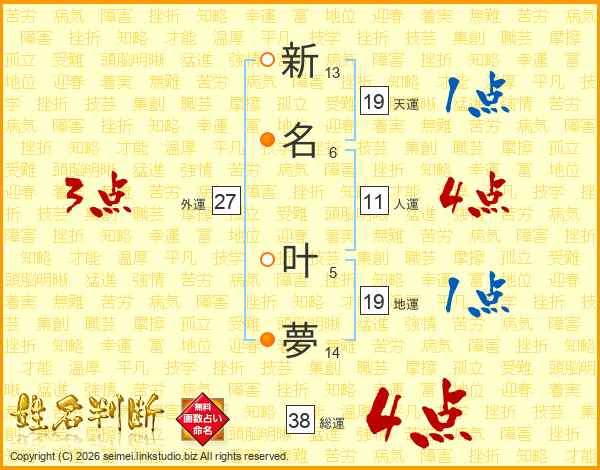 生活面を象徴する運勢です。外部から受ける影響力を表し、結婚運、家庭運や職場、環境への順応性を表します。総運から人運を引いた画数。姓や名が1文字の場合を除く。