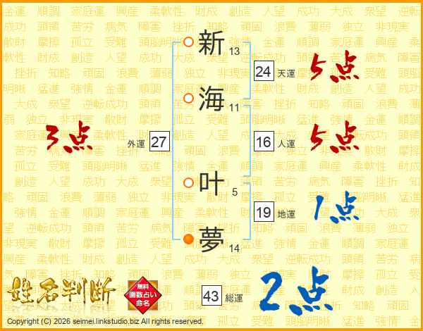 生活面を象徴する運勢です。外部から受ける影響力を表し、結婚運、家庭運や職場、環境への順応性を表します。総運から人運を引いた画数。姓や名が1文字の場合を除く。