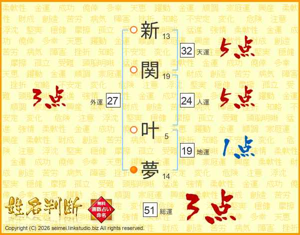 生活面を象徴する運勢です。外部から受ける影響力を表し、結婚運、家庭運や職場、環境への順応性を表します。総運から人運を引いた画数。姓や名が1文字の場合を除く。