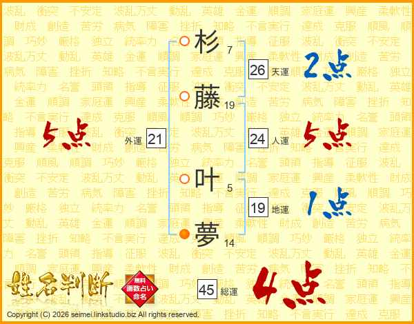杉藤叶夢さんの総運は45画の4点!