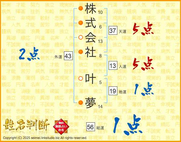 株(10画)式(6画)会(13画)社(8画) 叶(5画)夢(14画)