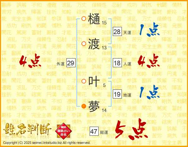 樋(15画)渡(13画) 叶(5画)夢(14画)