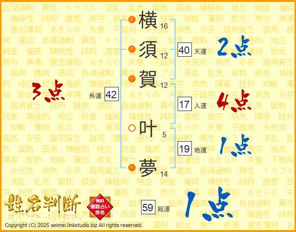 横(16画)須(12画)賀(12画) 叶(5画)夢(14画)