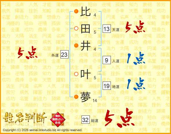 比(4画)田(5画)井(4画) 叶(5画)夢(14画)