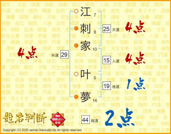 生活面を象徴する運勢です。外部から受ける影響力を表し、結婚運、家庭運や職場、環境への順応性を表します。総運から人運を引いた画数。姓や名が1文字の場合を除く。
