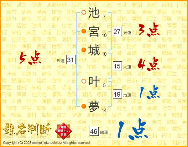 池(7画)宮(10画)城(10画) 叶(5画)夢(14画)