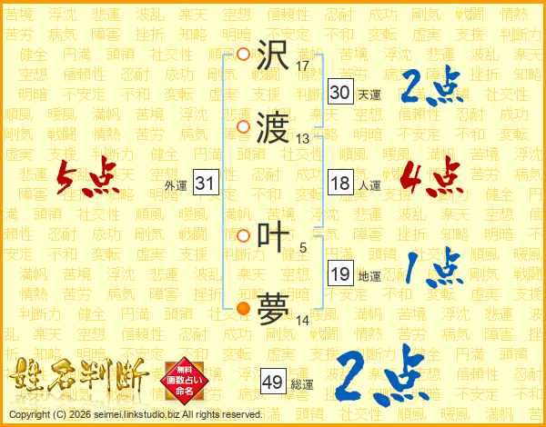 沢(17画)渡(13画) 叶(5画)夢(14画)