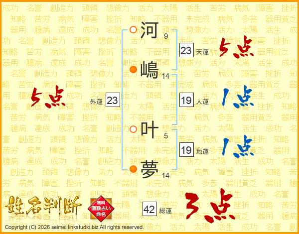 河(9画)嶋(14画) 叶(5画)夢(14画)