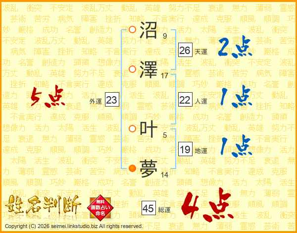 沼(9画)澤(17画) 叶(5画)夢(14画)