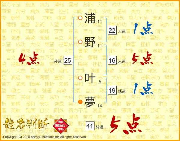 浦(11画)野(11画) 叶(5画)夢(14画)