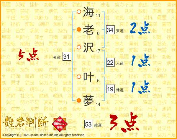 海(11画)老(6画)沢(17画) 叶(5画)夢(14画)