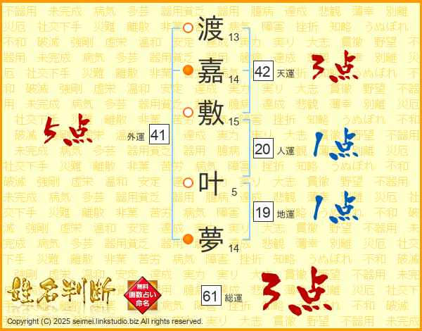 渡(13画)嘉(14画)敷(15画) 叶(5画)夢(14画)