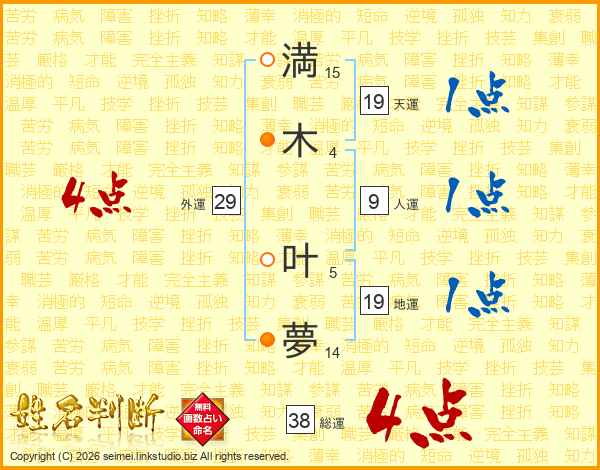 満(15画)木(4画) 叶(5画)夢(14画)
