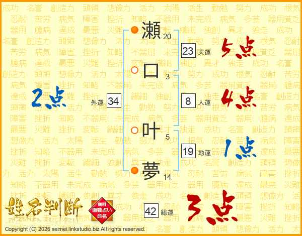 瀬口叶夢さんの天運は23画の5点!