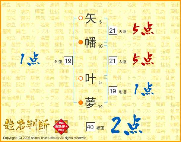 矢(5画)幡(16画) 叶(5画)夢(14画)