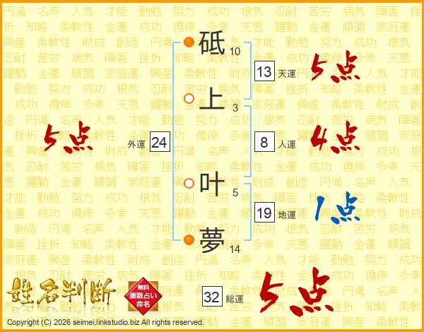 砥(10画)上(3画) 叶(5画)夢(14画)