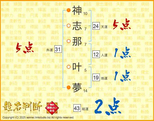 神(10画)志(7画)那(7画) 叶(5画)夢(14画)