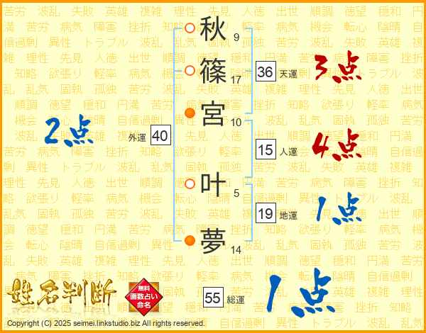 秋(9画)篠(17画)宮(10画) 叶(5画)夢(14画)