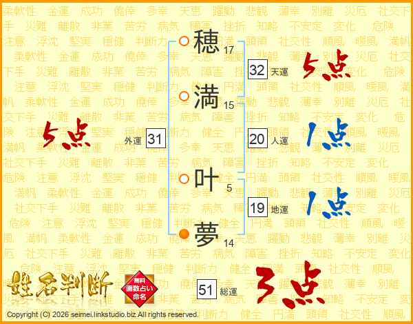 穂(17画)満(15画) 叶(5画)夢(14画)