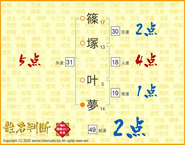 篠(17画)塚(13画) 叶(5画)夢(14画)