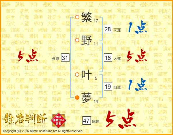 繁(17画)野(11画) 叶(5画)夢(14画)
