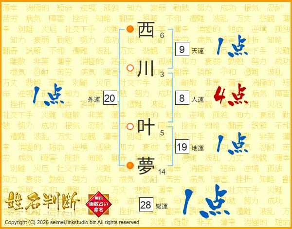 生活面を象徴する運勢です。外部から受ける影響力を表し、結婚運、家庭運や職場、環境への順応性を表します。総運から人運を引いた画数。姓や名が1文字の場合を除く。