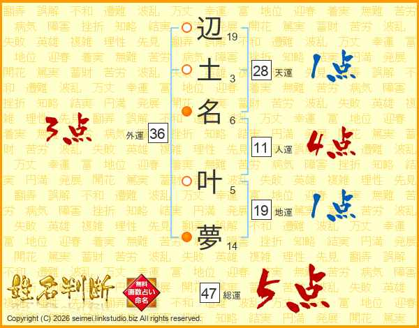 辺(19画)土(3画)名(6画) 叶(5画)夢(14画)