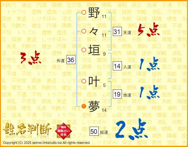 野(11画)々(11画)垣(9画) 叶(5画)夢(14画)