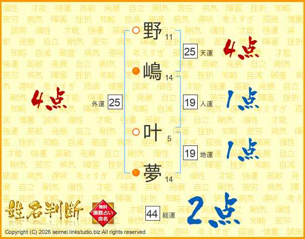 野嶋叶夢さんの天運は25画の4点!