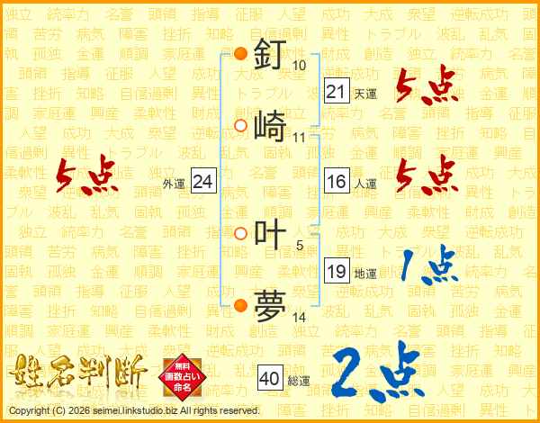 釘崎叶夢さんの天運は21画の5点!