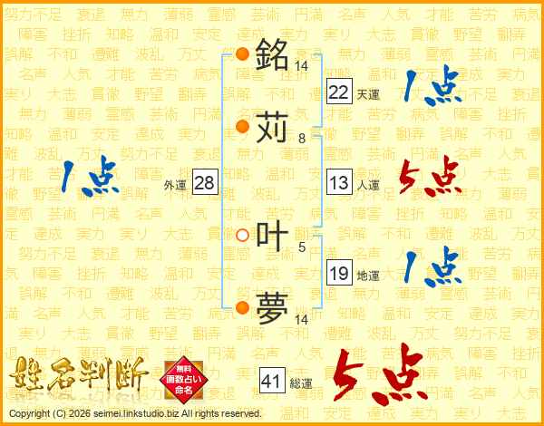 銘苅叶夢さんの総運は41画の5点!