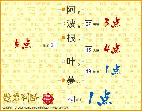 阿(8画)波(9画)根(10画) 叶(5画)夢(14画)