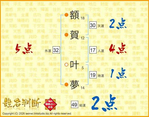 額(18画)賀(12画) 叶(5画)夢(14画)