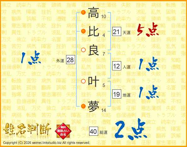高(10画)比(4画)良(7画) 叶(5画)夢(14画)