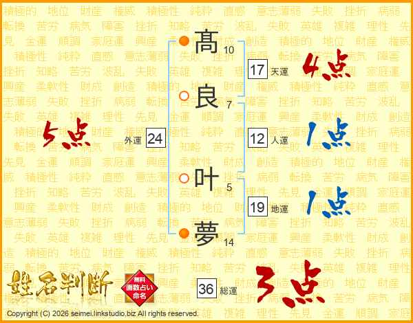 髙(10画)良(7画) 叶(5画)夢(14画)