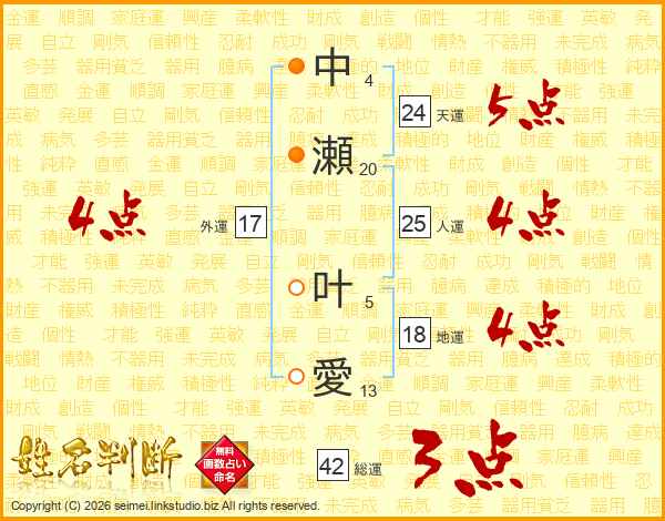 中(4画)瀬(20画) 叶(5画)愛(13画)