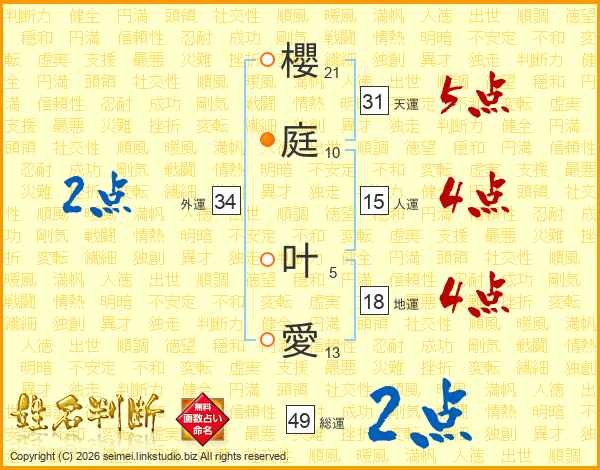 櫻(21画)庭(10画) 叶(5画)愛(13画)