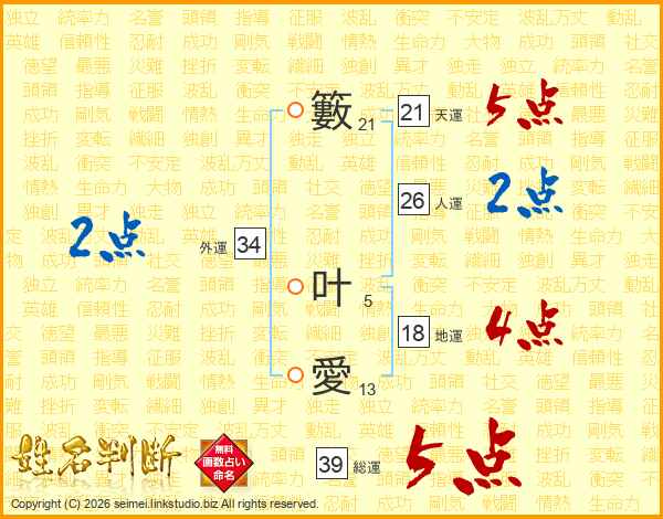 生活面を象徴する運勢です。外部から受ける影響力を表し、結婚運、家庭運や職場、環境への順応性を表します。総運から人運を引いた画数。姓や名が1文字の場合を除く。