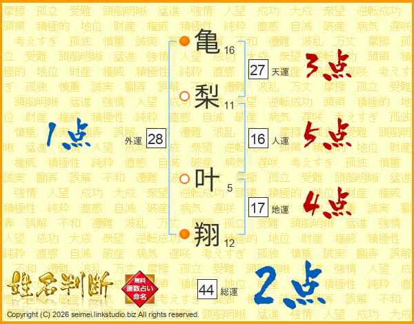 亀(16画)梨(11画) 叶(5画)翔(12画)