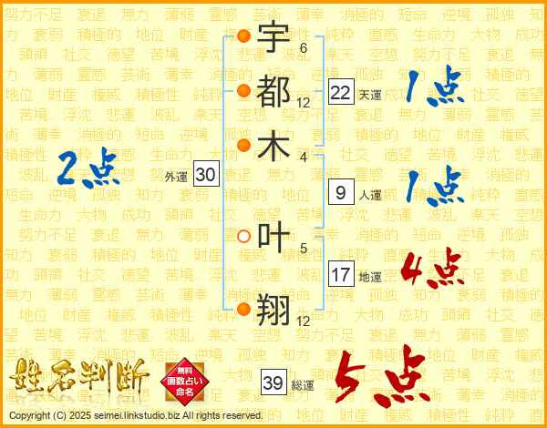 宇(6画)都(12画)木(4画) 叶(5画)翔(12画)