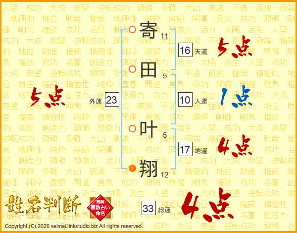 寄(11画)田(5画) 叶(5画)翔(12画)