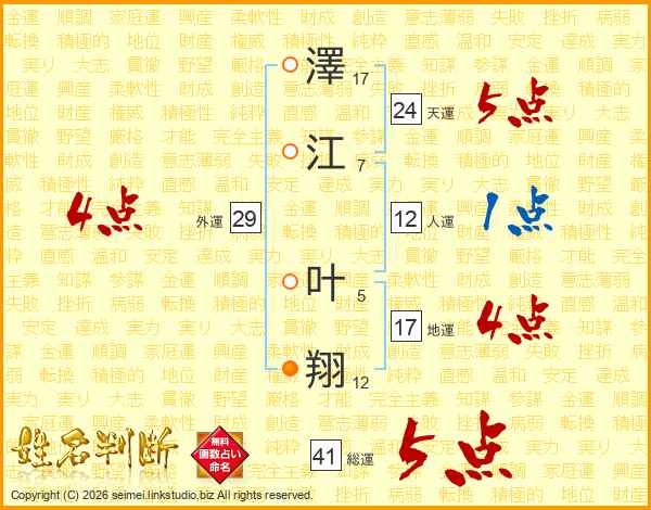 澤江叶翔さんの総運は41画の5点!