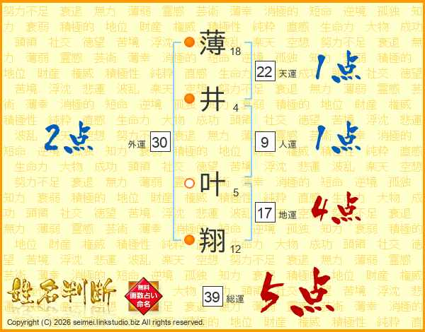 薄井叶翔さんの総運は39画の5点!