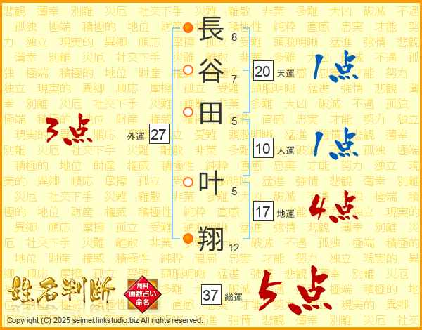 長(8画)谷(7画)田(5画) 叶(5画)翔(12画)