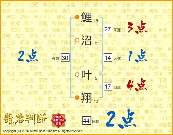 鯉(18画)沼(9画) 叶(5画)翔(12画)