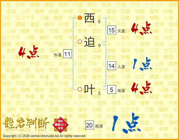 生活面を象徴する運勢です。外部から受ける影響力を表し、結婚運、家庭運や職場、環境への順応性を表します。総運から人運を引いた画数。姓や名が1文字の場合を除く。
