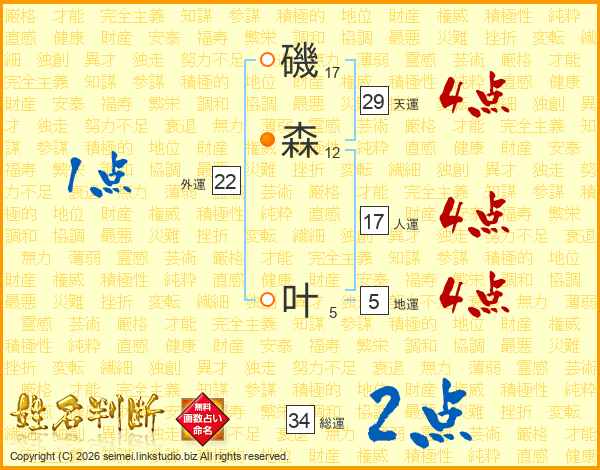 磯森叶さんの総運は34画の2点!