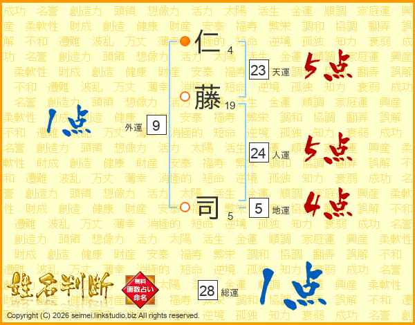 仁(4画)藤(19画) 司(5画)